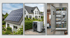 Draufsicht auf ein weißes Haus mit Solarpaneelen und einer Terrasse, umgeben von weiteren Häusern und Bäumen.